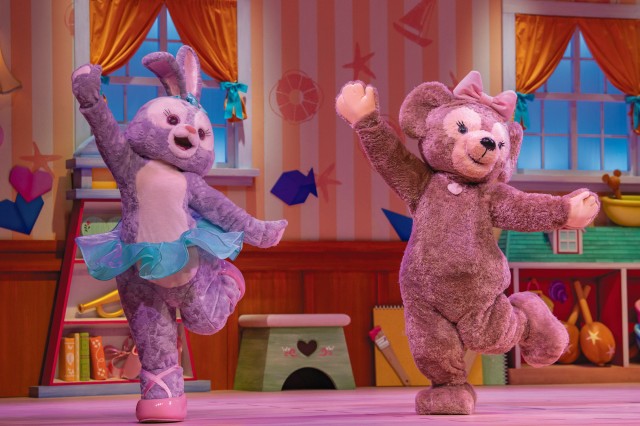 楽しそうな音楽のイントロとともに幕が開くと、シェリーメイ、ダッフィー、ステラ・ルー、ジェラトーニの4人の姿が!!