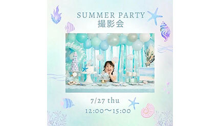 初日の7月27日は、めちゃくちゃかわいいパーティーセッティングの空間で撮影を行う「SUMMER PARTY撮影会」を実施する。カメラマンの木村理恵氏、安藤由佳氏が撮影を担当し、それぞれ6カットずつ納品する。SNS掲載が可能であれば、カット数を少し増やす。小さい子ども向けの椅子を用意しているが、一人で座れない赤ちゃんは親子ショットのみの撮影となる。