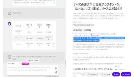 「Xaris」は、従来のツールとは異なるコンセプトで設計され、「人が書く」ことを主体として書きたい内容を整理したり、執筆するための資料を代わりに検索したり、アンケートなどのデータを記事に直したりといった、執筆に必要となる細かな作業をサポートする。