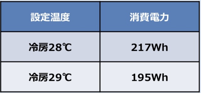 外気温が35°Cで30分間運転を行うとき、設定温度が28°Cの場合は消費電力217Wh、29度の場合は195Whと、約10.1%の差が出ました(※1)」