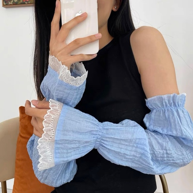 「サマーフェミニン」日除けスリーブは、ふんわりとしたシルエットが特徴の、フェミニンな日除けスリーブです。