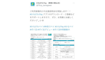 神奈川県は、「神奈川県キャッシュレス・消費喚起事業<第3弾>かながわPay 3万円分ポイント還元キャンペーン」を7月27日10時に開始する。このポイント還元キャンペーンの開始に先立ち、かながわPayの公式Twitterアカウント(@70cp_kanagawa)は7月20日、県内の商業施設で利用者向け出張説明会を開催すると告知した。