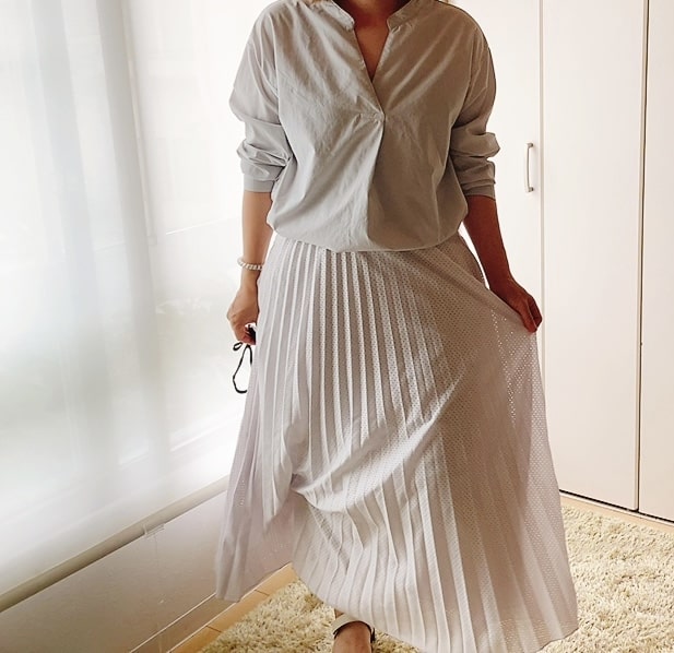 プリーツスカートと合わせればフェミニンなスタイルを演出できます。全体的に縦長のシルエットになるので、スタイルアップ効果も期待できます。