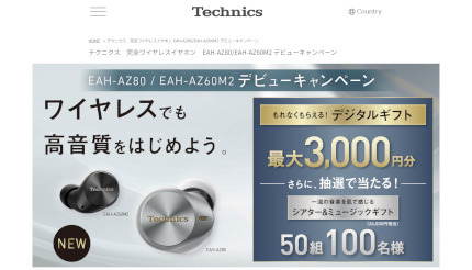 パナソニックは、「テクニクス」ブランドで展開している完全ワイヤレスイヤホン「EAH-AZ80/EAZ-AZ60M2」の販売が好調なことから、現在実施中のデビューキャンペーンの応募締切日を当初の8月21日から「9月29日16時59分」に延長した。