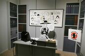エントランスを入ると、キャラクターのシルエットとスポットライトが当たった作品ロゴが、来場者をお出迎え。