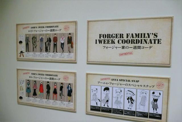 また、フォージャー家のリビングが再現されており、家族の絆が垣間見える額装イラスト、1週間コーディネートのパネルも展示されている。