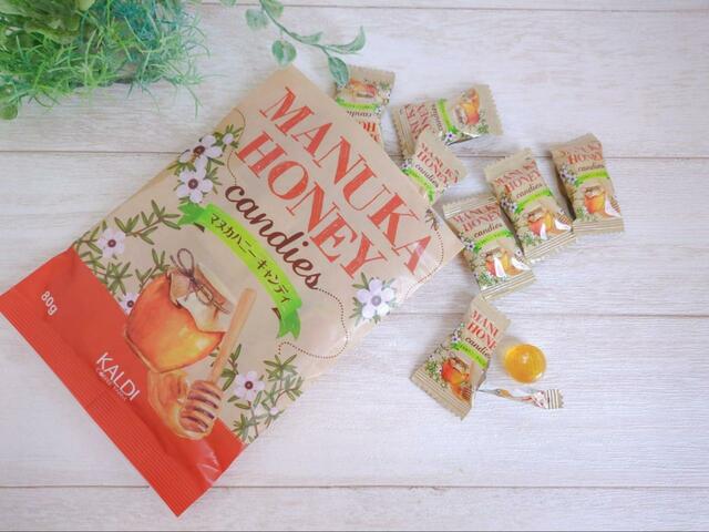 飴は酸味料、香料、着色料などが添加されていることが多く、無添加のものが意外と見つけにくいのですが、カルディブランドのマヌカハニーキャンディはシンプルな材料のみで作られています。