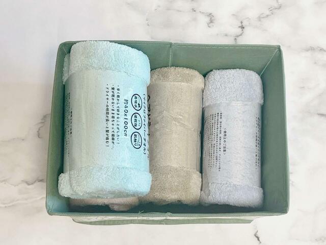ストックしている40cm×100cmの大判ヘアドライ用タオルを4枚入れてみましたが、楽々収納できました。