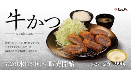 松屋フーズは7月26日(本日)15時、とんかつ専門店「松のや」の全国店舗(一部を除く)において同社のステーキ業態「ステーキ屋 松」で使用している赤身肉を用いた「牛かつ」の販売を開始する。価格は、「牛かつ定食」が990円、「ロースかつ&牛かつ1枚定食」が950円、「ロースかつ&牛かつ2枚定食」が1250円。