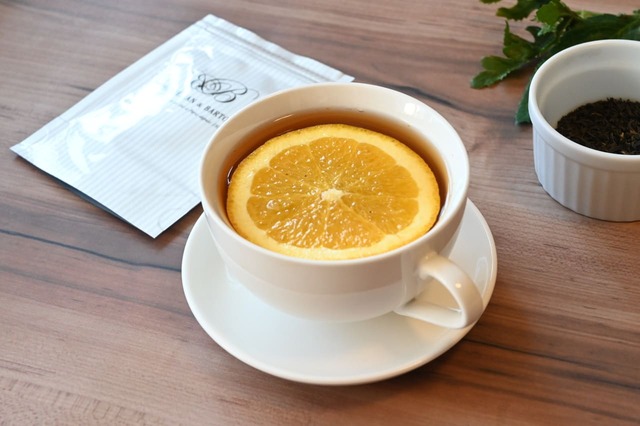 オレンジの輪切りを浮かべた紅茶は「シャリマティー」とも呼ばれ、インド・ムガール王朝時代の美しい花園「シャリマ」に由来した紅茶の飲み方なのだそう。まるで大輪のお花が咲いたようなアレンジは、おもてなしにもぴったりです。