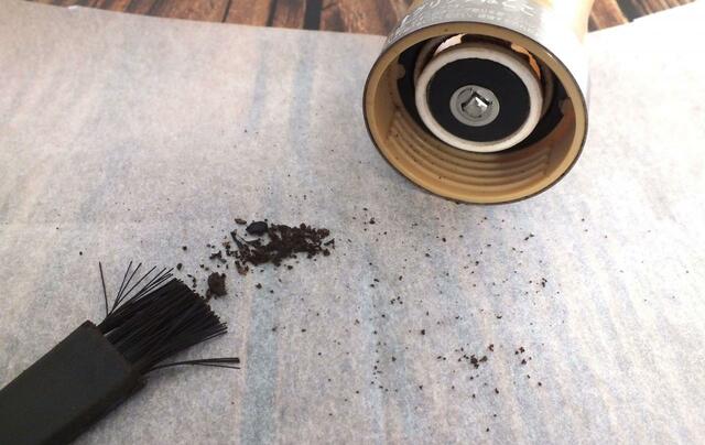 コーヒー専門店で購入したコーヒーミル掃除専用ブラシを使用すると、簡単にキレイに落とせますよ。