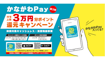 今回で3回目となるかながわPayキャンペーンの利用方法は、第1弾から大きな変更はない。専用アプリ「かながわPay」アプリでかながわPay加盟店に掲出されたコードを読み取り、選んだスマートフォン決済サービス(au PAY、d払い、はまPay、LINE Pay、楽天ペイ、AEON Pay)で決済すると、キャンペーン期間中のみ使える期間限定ポイントとして決済日の8日後をめどに決済額の10%または20%が付与される。期間中の還元上限は1人につき3万ポイント。