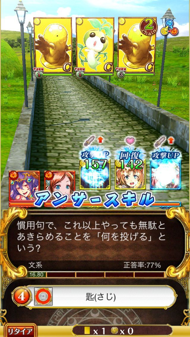 アンサースキルはクイズに5秒以内に回答して正解した際に発動するもの。ダメージをアップしたり同属性のカードのHPを回復させたりといった効果がある。これは5秒位内に回答すれば何度でも発動できるので、毎回狙っていきたい。