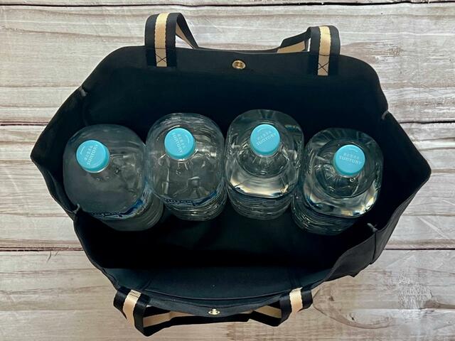 楽々収納できましたが、底板がないため、ペットボトルを4本入れてしまうと持つ時に少しへたれてしまうかもしれません。