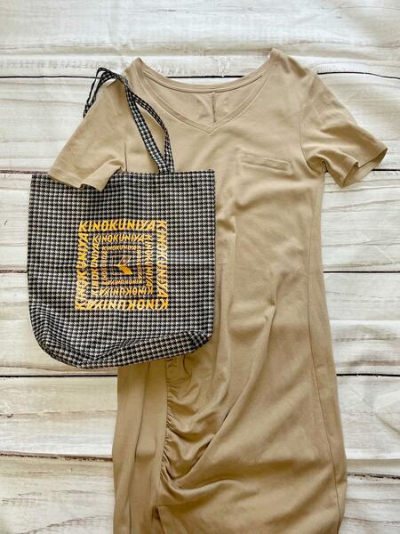 チェック柄トートバッグの色合いが晩夏〜秋にぴったりなので、ベージュやブラックに合わせるのがおすすめです。