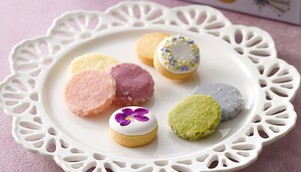 宝塚大劇場が有名な兵庫・宝塚にある『パティスリー マグノリア』。ここで作られるクッキー缶は、夢のような美しさ。長さ15cmほどの缶のなかには、宇治抹茶、ビーツ、紫芋などナチュラルな素材を使ったディアマンクッキーと、繊細な宝塚産エディブルすみれをあしらったバタークッキーが入っている。可愛すぎる缶をどう使おうか、食べた後もワクワクが続くスイーツだ。