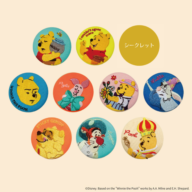 刺繍缶バッジは、色々な表情のプーさんがモチーフになっています。