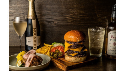 「スマッシュパティの7段ハンバーガー」は、米沢牛を使用したスマッシュパティと、チーズを大胆に重ねて仕上げたニュースタイルバーガー。シンプルながら肉本来の旨味と食感を堪能できる。