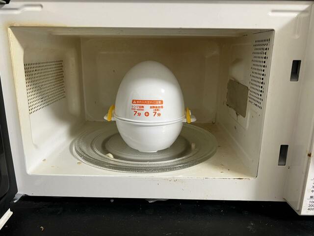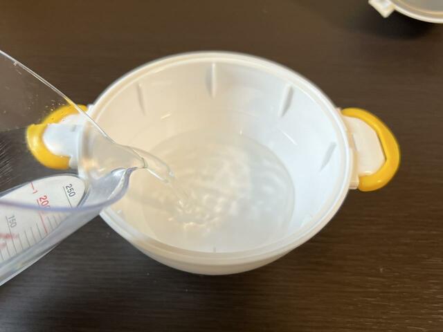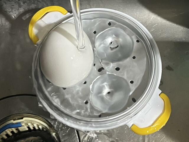 電子レンジでの加熱と加熱後の放置時間が終わったら、フタをとり水で冷まします。これでゆでたまごの完成です!