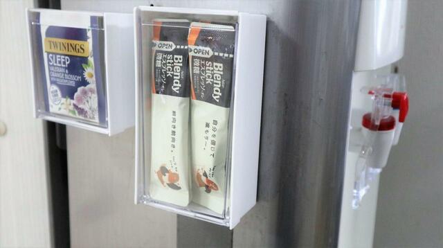 スタンダードタイプは紅茶のティーバッグ、トールタイプは粉末のスティックコーヒーがぴったりです。こうなっていれば、飲みたいときにすぐ作れますね。