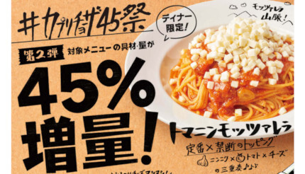 カプリチョーザでは8月1~7日まで、対象メニュー3品の具材と量を創業45周年にかけて45%増量し、通常価格のまま特別メニューとして販売している。提供時間はディナータイム(17時、一部店舗は17時30分)~各店のラストオーダーまで。