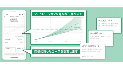 お金を「分ける」ことから始める新しいコンセプトで、設定した目標から最適な積立プラン(商品・金額・期間)を提案する。目標達成までの将来シミュレーションを見つつ、複数の利回り(0%、2%、3%、4%、5%、6%)のコースから選択できる。