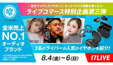 JLab Japanと日本最大級のライブ配信アプリ「17LIVE(イチナナ)」を運営する17LIVEは、JLab Japanが展開する完全ワイヤレスイヤホンのプロモーションの一環として8月4日から6日までの3日間、「17LIVE」を活用した「ライブコマース配信」を実施する。