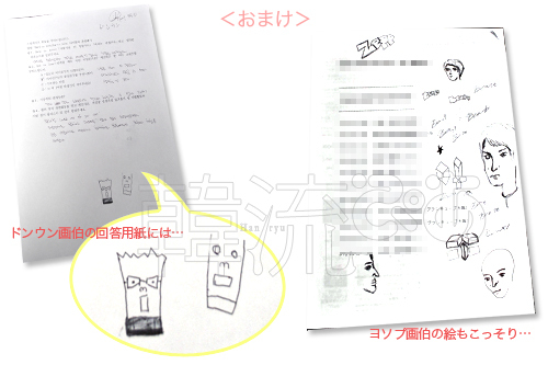 ドンウン画伯の回答用紙(表)とヨソプ画伯の落書き