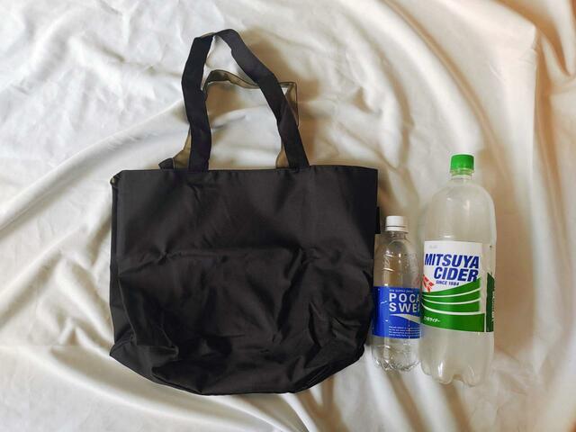 バッグは、500mlはもちろん1000mlのペットボトルも入れることができる大きさ。素材が「ポリエステル」で柔らかいので、たくさん入れても重さを感じにくいところも魅力と感じました。