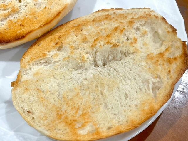 クラストはカリカリッと軽い食感なのに対し、クラムはギュギュッとしつつ、ふわモチ食感。ヒキはなく歯切れが良いのですが、キメの細かいふくらみで、しっとりねっちりとした生地がクセになります。