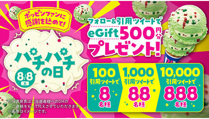 応募方法は、「@BR31_Icecream」をフォローし、「#サーティワンパチパチの日」をつけて引用ツイート。引用ツイート数に応じて当選人数が増えていき、最大888人にeGift500円分をプレゼントする。応募期間は8月8日23時59分まで。