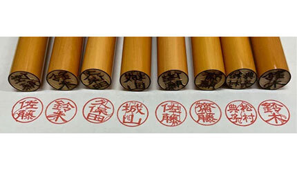 価格は、シャチハタ社製(9ミリ丸)の浸透印タイプで2490円から、本柘製など(12ミリ丸)の印鑑タイプで3620円から。納期は、デザイン制作に約1週間、購入者から校正OKの返事後、シャチハタで約10日、印鑑で約2週間となる。