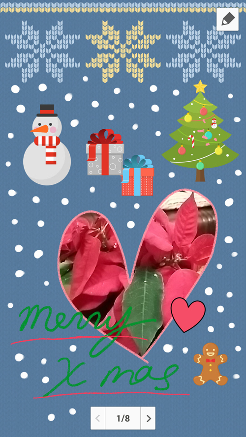 私は雪の結晶マークがポイントの、ニット素材のような背景をチョイス。さらにクリスマス系イラストを追加したり、ポインセチアの写真をハートの枠で撮ったりしました。