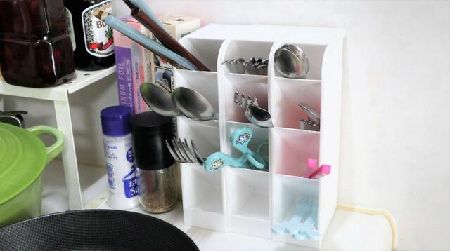 これまでは引き出しの中で筒型スタンドに入れていたのですが、自分以外の家族は探すのに少し手間取るようでした。これならどこに何があるか、誰でもすぐにわかるので迷いません。
