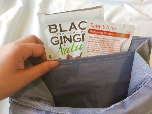 ポケットには、薄いアイテムを入れることができます。今回の記事では、普段よく愛飲している持ち運びタイプのサプリを入れてみました。