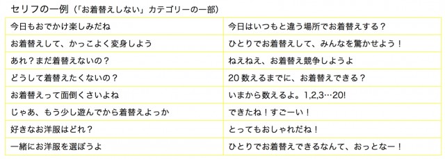 セリフについては専門家の監修と実態調査結果をふまえて考案され、実際に子どもたちの反応がよかったものを中心に搭載されています。