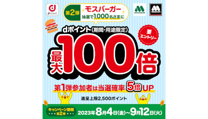 NTTドコモは、モスフードサービスが経営する「モスバーガー」において、キャンペーンサイトでエントリーのうえ、注文時にdポイントカードを提示するか、dポイントカードを登録した「モスのネット注文」で持ち帰り注文をオーダーしてdポイントを1ポイント以上ためた人に抽選でdポイントを最大100倍付与する「モスバーガー dポイントキャンペーン第2弾」を9月12日23時59分まで開催している。