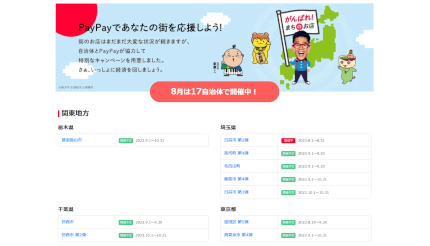PayPayは、地方自治体と連携し、「PayPay」の決済プラットフォームを活用したキャンペーンなどを通じて地域経済を盛り上げていく取り組み「あなたのまちを応援プロジェクト」において、8月以降に新たに13のキャンペーンを実施する。8月は静岡県静岡市、愛知県岡崎市・豊田市、埼玉県日高市、大阪府東大阪市など、17自治体でキャンペーンを実施中だ。