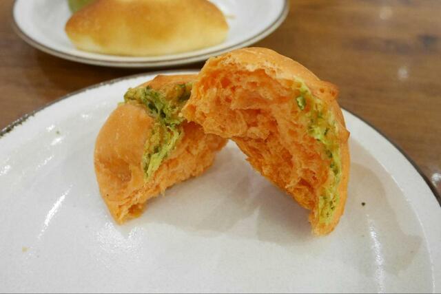 トマトが練り込まれた赤いパン生地の上に、コクのあるバジルソースがちょこんと乗っています。