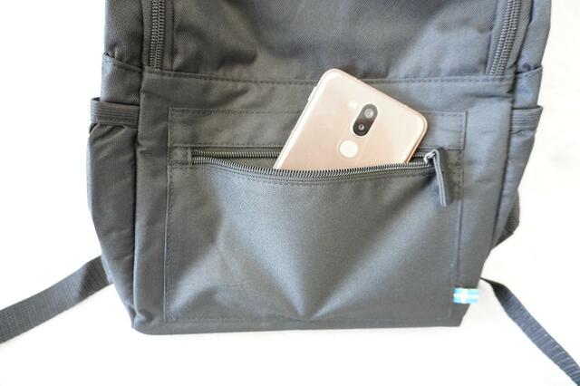 長財布も縦にすっぽり入るほどの大きいサイズのポケットです。レジでリュックを下ろさず会計できるところも大きなメリットですね。