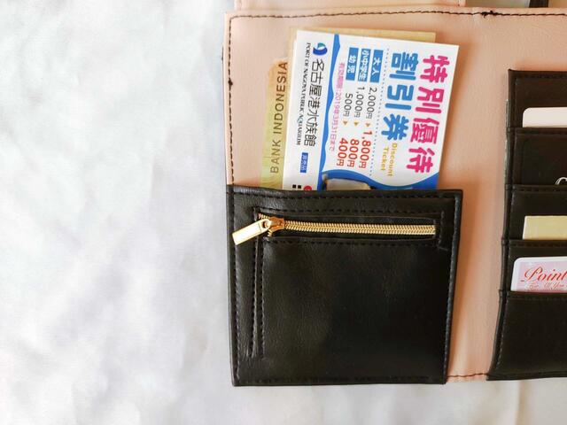 今回の記事では、水族館の割引券とインドネシアのお札をいれてみました。海外旅行の時は「右側に日本札」、「左側に海外のお札」を入れて使うこともできそう♪
