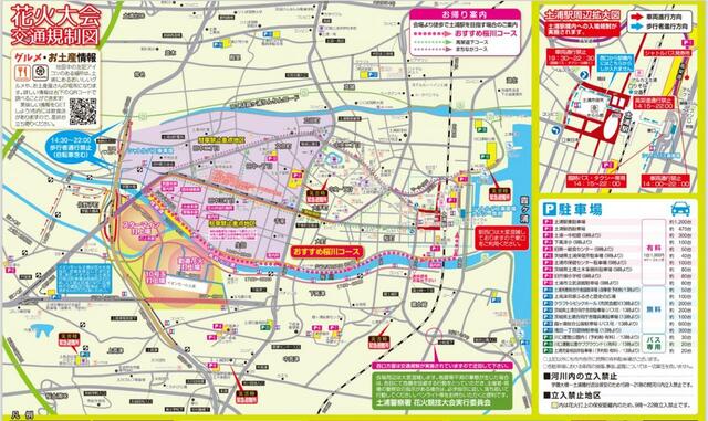 駐車禁止の場所や立ち止まってはいけない場所などがありますので、誘導に従ってくださいね。(※参照 2022年度版「花火大会」交通規制地図)