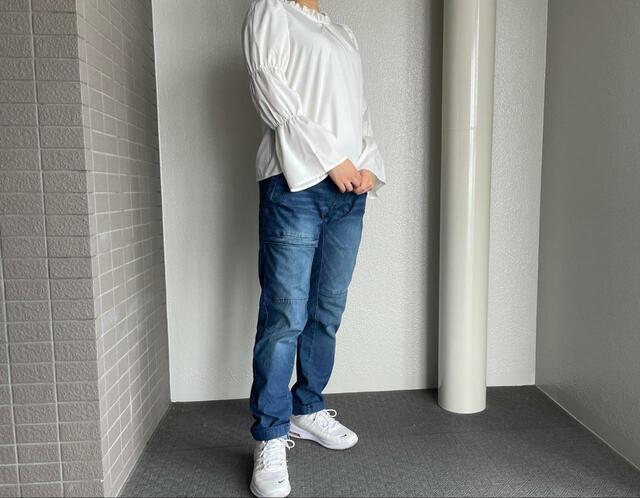 カジュアルにまとめた方がいいのか…と悩みましたが、意外とオフィスカジュアルなトップスとも合うことがわかりました。