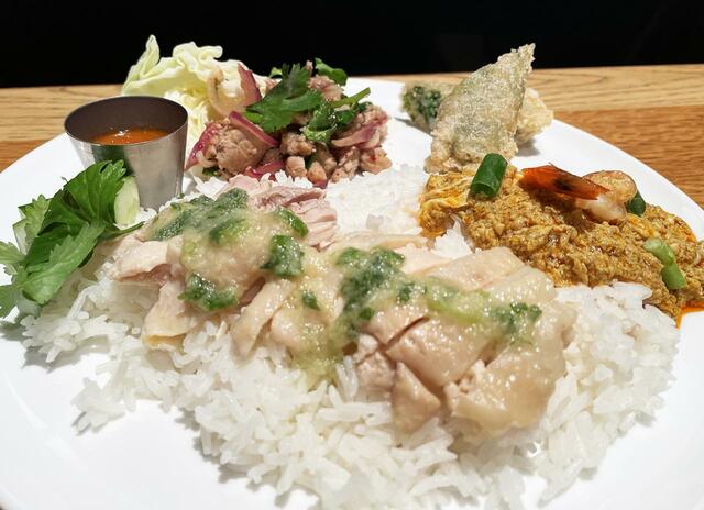 「茹で鶏のジンジャーソースがけ」は、しっとりとした茹で鶏と、そこにかけられたジンジャーソースとタナチオ(タイの豆味噌)ソースとの相性も抜群で、ご飯がグングン進んでしまいました。