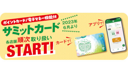 サミットは今年6月、現金でチャージ可能な自社電子マネー一体型ポイントカード「サミットカード」を導入し、あわせて公式アプリ「サミットアプリ」に電子マネー機能を追加した。当初はサミットストア3店舗、コルモピア2店舗だけだったが、2023年8月末に全店導入完了予定だ。今回は、公式アプリに事前チャージ型の電子マネー機能を追加したスーパー・ドラッグストアをまとめた。