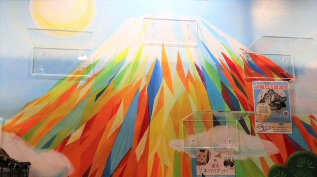 右側の壁にはキャットステップのあるアートな富士山が。右側のタイル風の壁には、ドミトリースペースの大きな窓があります。