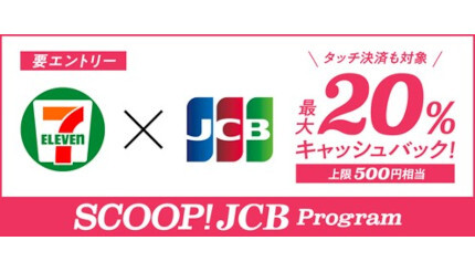 ジェーシービーは8月18日~31日の期間、セブン-イレブン・ジャパンと「セブン-イレブンでJCBカードを利用すると最大20%キャッシュバック!」キャンペーンを実施する。