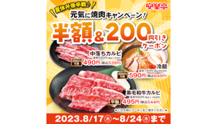 焼肉レストラン「安楽亭」で、「黒毛和牛カルビ」を半額にする「元気に焼肉キャンペーン!」を8月17日~24日の期間に、食べ放題コース10%オフに加えて飲み放題を100円割り引く「食べ放題&飲み放題キャンペーン」を8月17日~31日の期間にそれぞれ実施している。