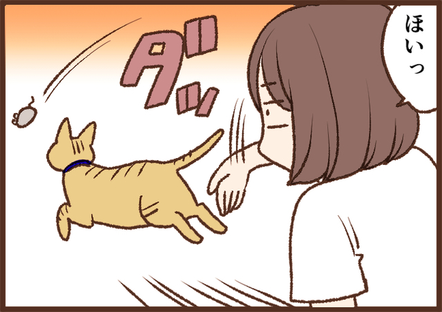 ハルちゃんは子猫の時も「とってこい」らしきことが大好きで、当時は投げると一応くわえて近くまで戻ってきていたのですが、なぜかある時を境に全然やらなくなり……。