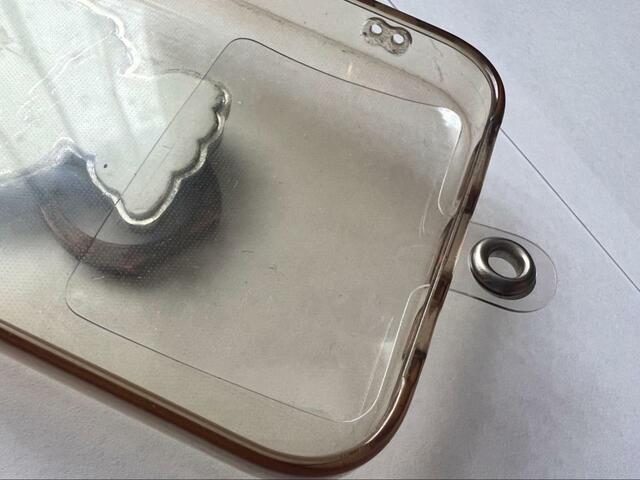 取り付け方は非常に簡単で、まずスマホケースに透明シートを入れ、透明シートとストラップの接続部分をスマホの充電口から出します。